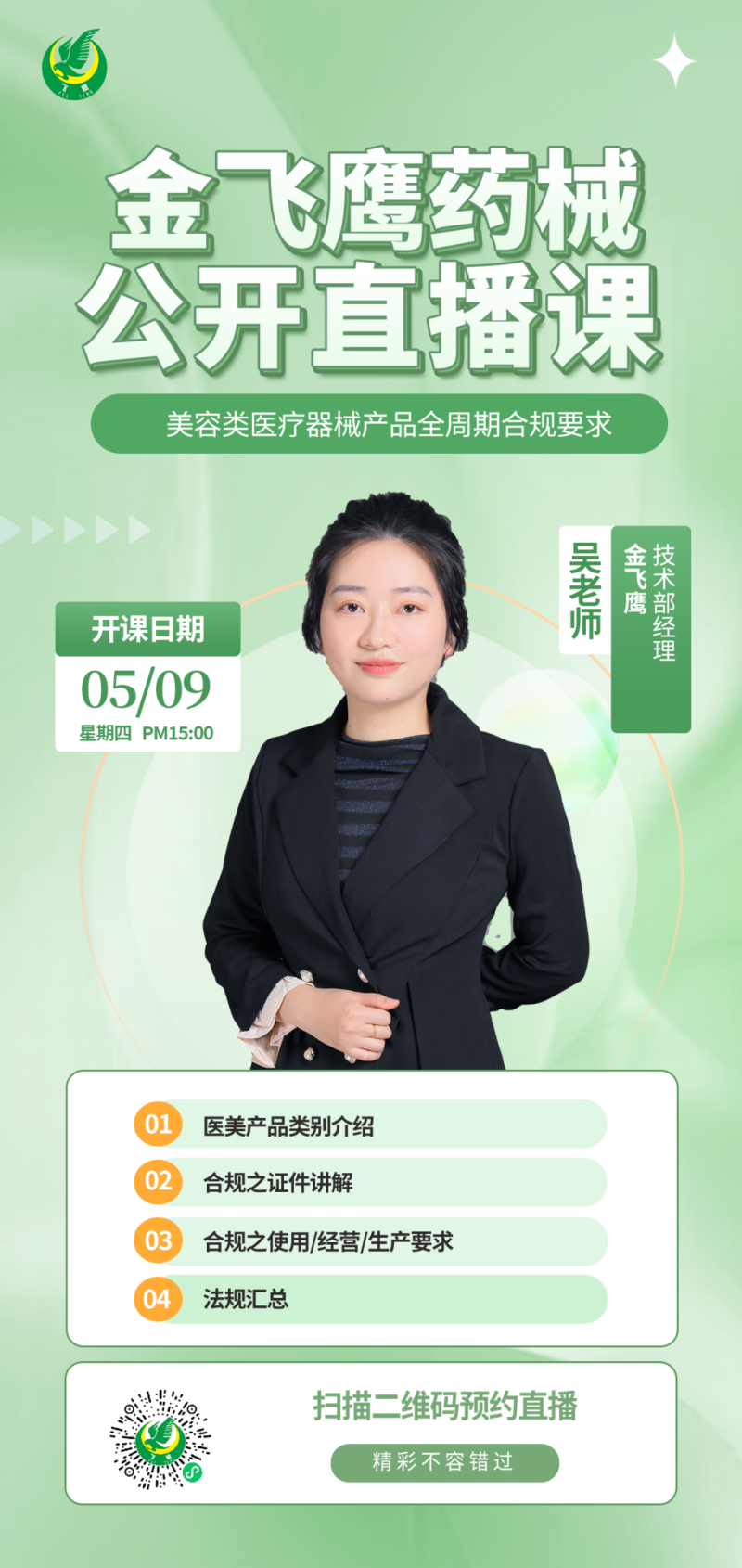 金飛鷹直播培訓(xùn),是每周一次的固定培訓(xùn)欄目,優(yōu)選金飛鷹國內(nèi)外資深注冊/項(xiàng)目老師定期為大家講解醫(yī)療器械注冊相關(guān)知識,解答大家在醫(yī)療器械注冊過程中的諸多疑問。