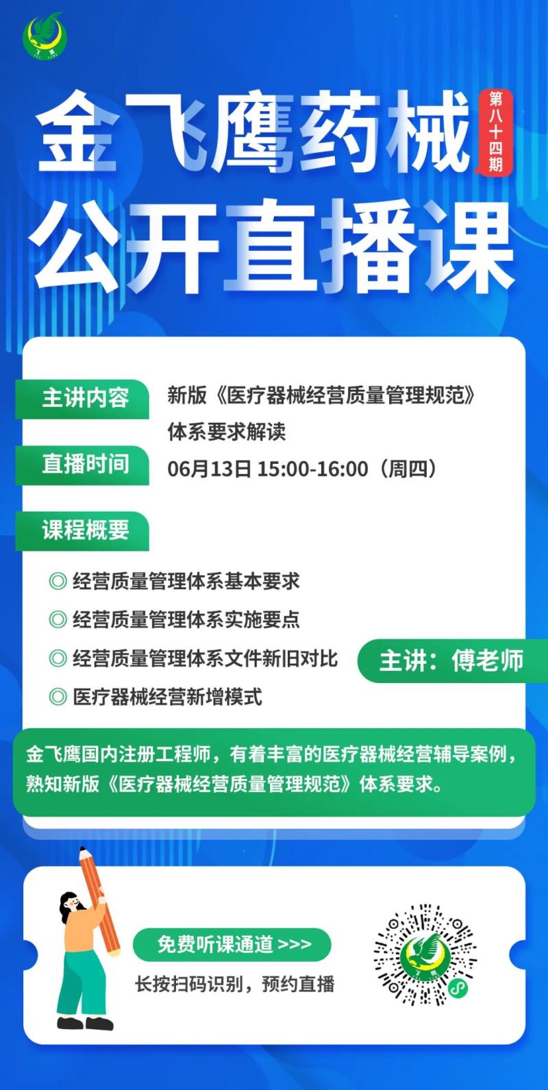 6月13日下午3點(diǎn),金飛鷹國內(nèi)注冊工程師,有著豐富的醫(yī)療器械經(jīng)營輔導(dǎo)案例,熟知《規(guī)范》體系要求的傅老師,給大家?guī)怼缎掳妗瘁t(yī)療器械經(jīng)營質(zhì)量管理規(guī)范〉體系要求解讀》,培訓(xùn)內(nèi)容包括經(jīng)營質(zhì)量管理體系基本要求、經(jīng)營質(zhì)量管理體系實施要點(diǎn)、經(jīng)營質(zhì)量管理體系文件新舊對比、醫(yī)療器械經(jīng)營新增模式等,醫(yī)療器械經(jīng)營企業(yè)千萬不要錯過了哦!