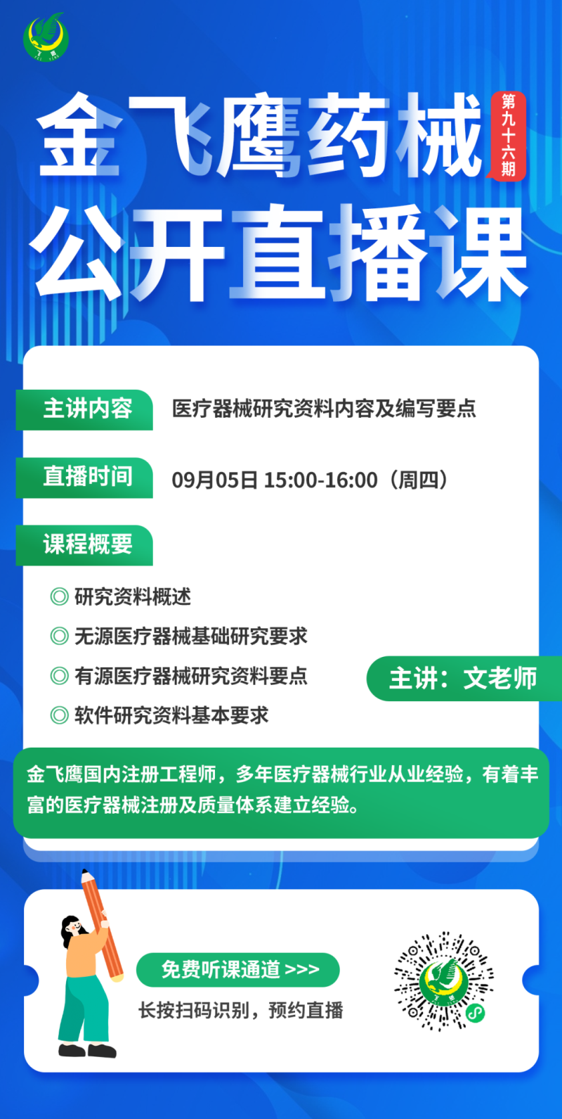 金飛鷹直播培訓(xùn),是每周一次的固定培訓(xùn)欄目,優(yōu)選金飛鷹國內(nèi)外資深注冊/項目老師定期為大家講解醫(yī)療器械注冊相關(guān)知識,解答大家在醫(yī)療器械注冊過程中的諸多疑問。