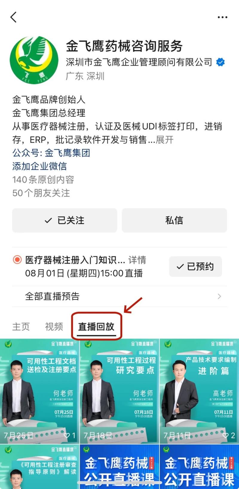 往期直播培訓(xùn)課程支持回放,關(guān)注“金飛鷹藥械咨詢服務(wù)”視頻號并點(diǎn)擊視頻號主頁,即可查看“直播回放”哦~