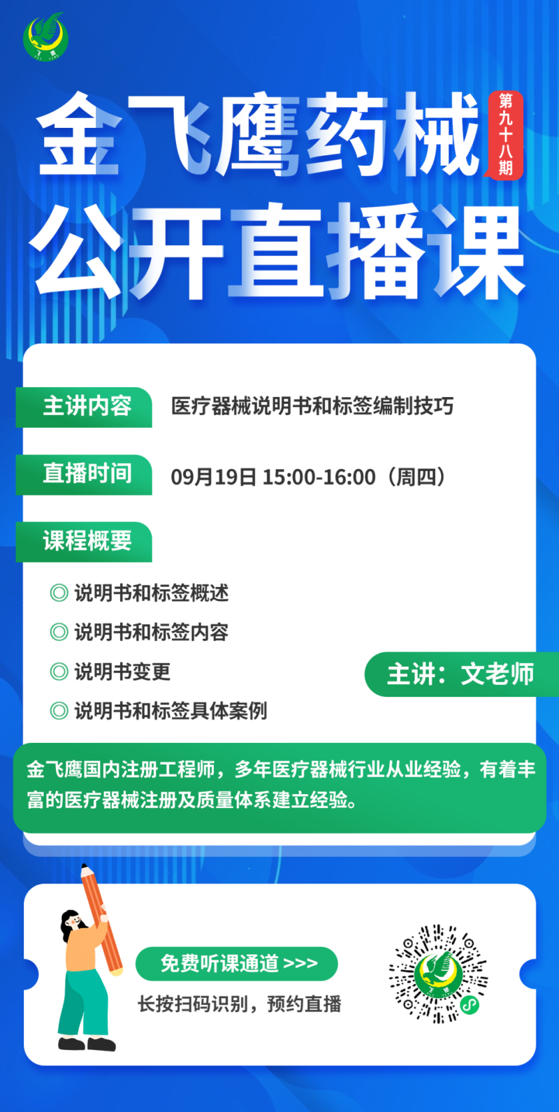 9月19日下午3點(diǎn),金飛鷹國內(nèi)注冊工程師,有著豐富的醫(yī)療器械注冊及質(zhì)量體系建立經(jīng)驗(yàn)的文老師,給大家?guī)怼夺t(yī)療器械注冊入門知識(shí)分享-產(chǎn)品說明書和標(biāo)簽編制技巧》,培訓(xùn)內(nèi)容包括說明書和標(biāo)簽概述、說明書和標(biāo)簽內(nèi)容、說明書變更、說明書和標(biāo)簽具體案例,大家千萬不要錯(cuò)過了!