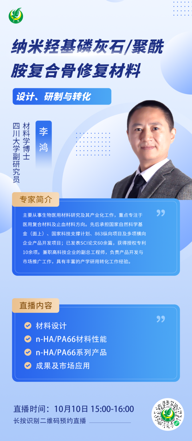 10月10日下午3點(diǎn),李老師給大家?guī)?/span>《納米羥基磷灰石/聚酰胺復(fù)合骨修復(fù)材料的設(shè)計(jì)、研制與轉(zhuǎn)化》,將從材料設(shè)計(jì)、材料性能、研究成果及市場(chǎng)應(yīng)用等方面給大家詳細(xì)介紹,對(duì)此類高分子材料感興趣的朋友千萬不要錯(cuò)過了哦~