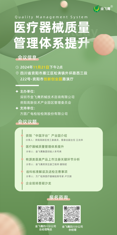 在此契機(jī)下,金飛鷹擬聯(lián)合資陽高新技術(shù)產(chǎn)業(yè)園區(qū)管理委員會(huì)、方圓廣電檢驗(yàn)檢測股份有限公司,于11月21日下午2點(diǎn),在資陽市創(chuàng)新創(chuàng)業(yè)園路演廳舉辦一場免費(fèi)培訓(xùn)會(huì),以金飛鷹集團(tuán)創(chuàng)始人車號(hào)爽主導(dǎo)的“醫(yī)療器械質(zhì)量管理體系提升”作為核心主題,助力企業(yè)質(zhì)量管理體系實(shí)現(xiàn)“質(zhì)的飛躍”!