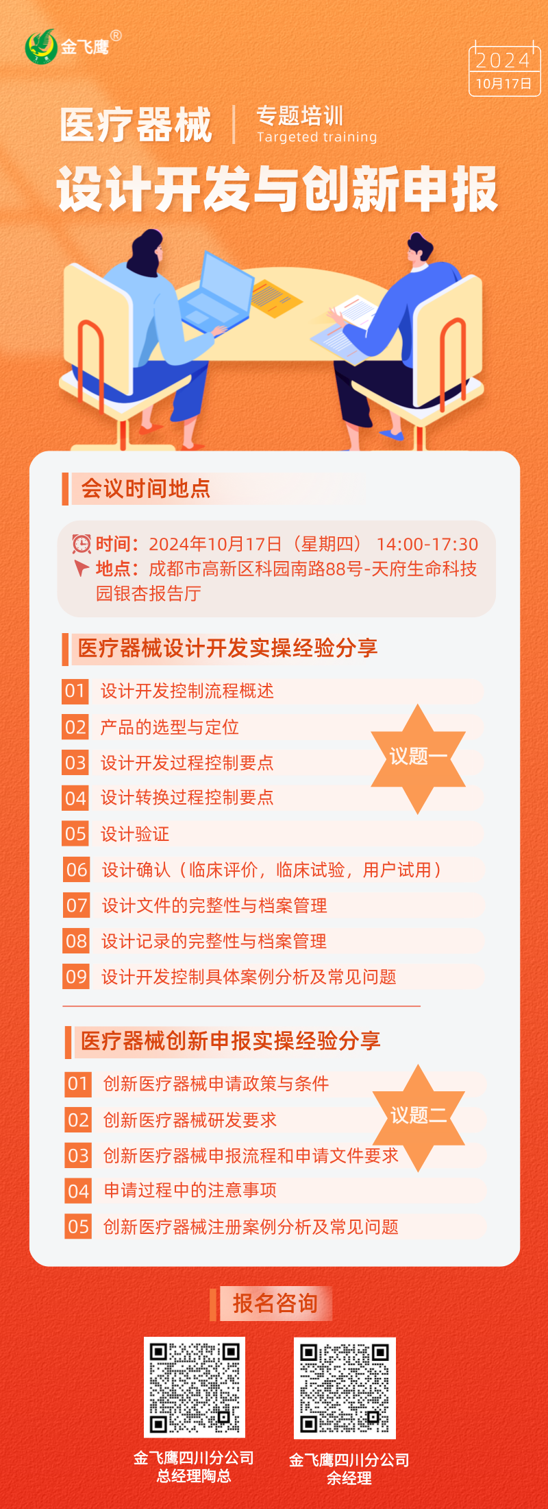 作為一家深耕醫(yī)療器械行業(yè)17年的專業(yè)咨詢公司,我們聯(lián)合成都高投生物醫(yī)藥園區(qū)管理有限公司,擬定于2024年10月17日14:00在成都天府生命科技園舉辦《醫(yī)療器械設(shè)計(jì)開(kāi)發(fā)與創(chuàng)新申報(bào)專題培訓(xùn)》,本期培訓(xùn)由金飛鷹集團(tuán)創(chuàng)始人、資深藥械認(rèn)證技術(shù)專家車號(hào)爽老師主導(dǎo),金飛鷹技術(shù)部經(jīng)理吳偉宏老師輔助,借助我們服務(wù)3000+客戶的輔導(dǎo)經(jīng)驗(yàn),根據(jù)產(chǎn)品、公司、人員情況,為您量身定制合規(guī)、高效、實(shí)用的設(shè)計(jì)開(kāi)發(fā)管理!誠(chéng)邀各地醫(yī)械企業(yè)報(bào)名參加!