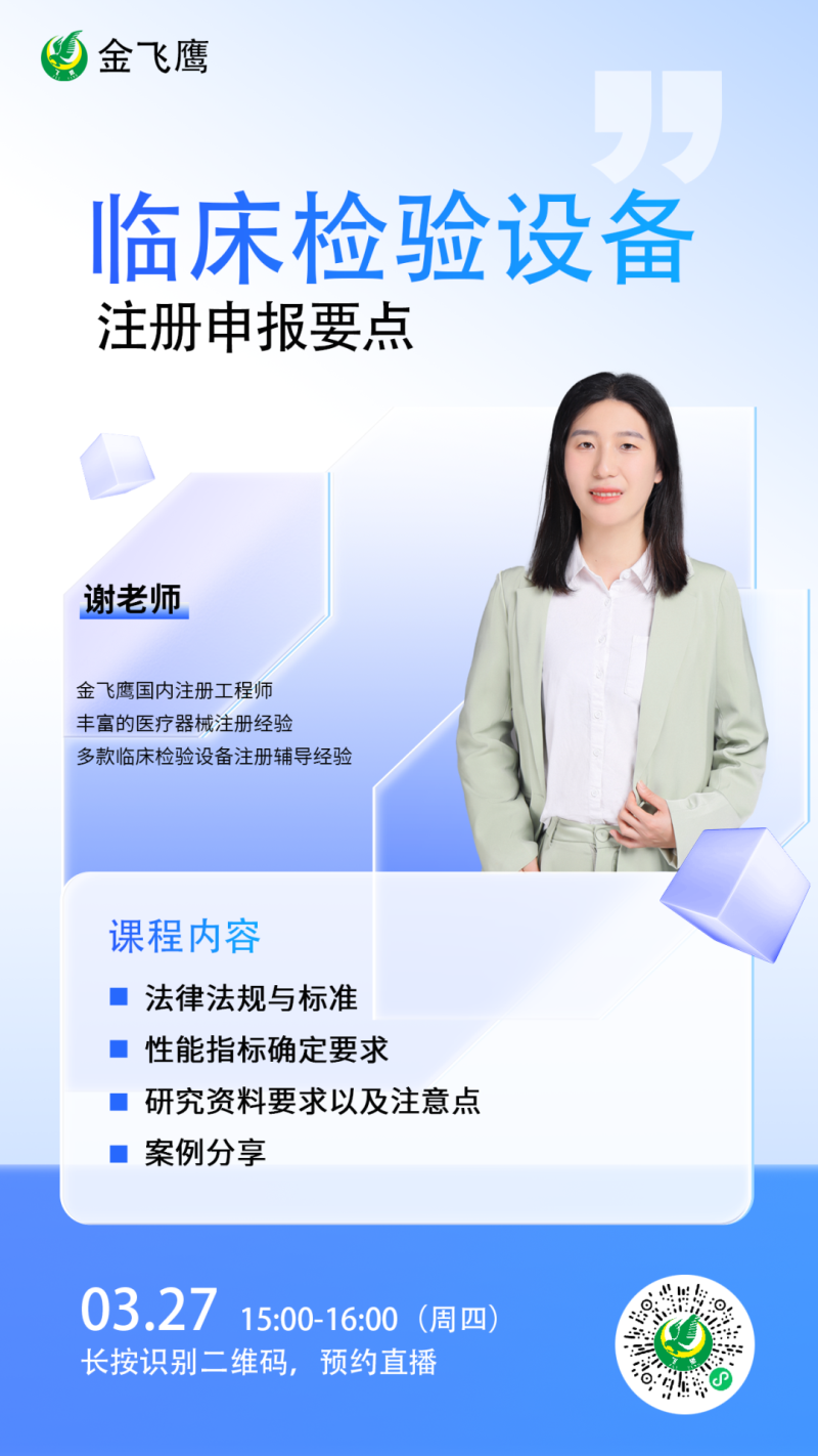 作為一家深耕醫(yī)療器械行業(yè)18年的專業(yè)咨詢公司,金飛鷹在臨床檢驗(yàn)設(shè)備注冊方面積累了豐富的實(shí)戰(zhàn)經(jīng)驗(yàn)(如核酸分子雜交儀、微陣列芯片掃描儀、幽門螺旋桿菌測試儀等),成功輔導(dǎo)了眾多企業(yè)完成注冊審批。因此,我們特別推出有關(guān)臨床檢驗(yàn)設(shè)備注冊的線上直播課,助力相關(guān)企業(yè)更高效地完成產(chǎn)品注冊申報。