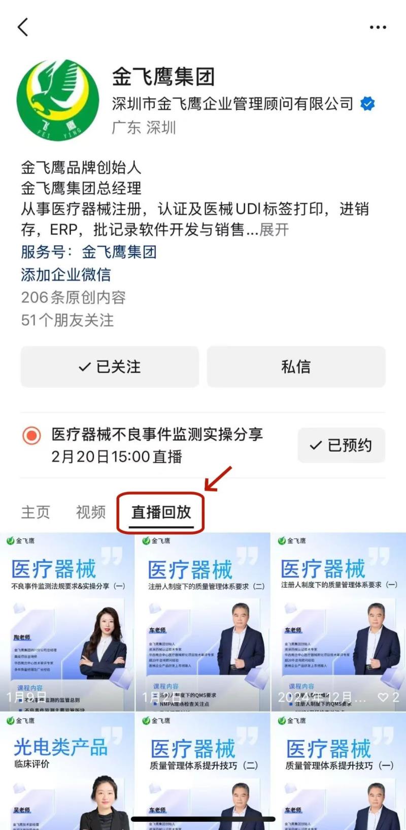 劃重點(diǎn)往期直播培訓(xùn)課程支持回放,關(guān)注“金飛鷹藥械咨詢服務(wù)”視頻號(hào)并點(diǎn)擊視頻號(hào)主頁,即可查看“直播回放”哦~