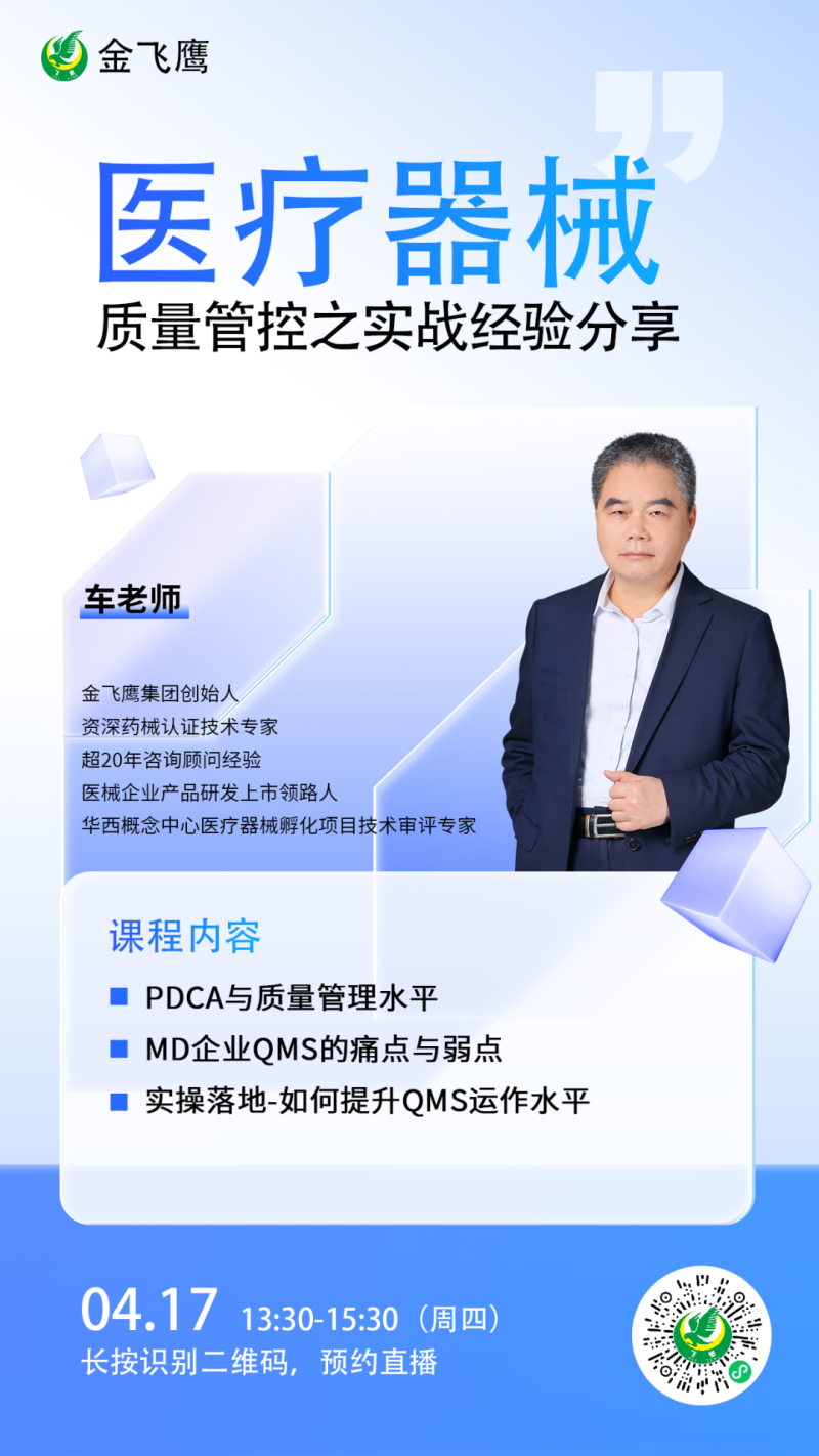 在此背景下,由金飛鷹、成都聯(lián)東U谷聯(lián)合主辦,成都高新區(qū)醫(yī)療器械創(chuàng)新轉(zhuǎn)化協(xié)會(huì)、動(dòng)脈網(wǎng)、成都數(shù)智醫(yī)療創(chuàng)新聯(lián)盟協(xié)會(huì)協(xié)辦的醫(yī)療器械質(zhì)量管理與注冊(cè)申報(bào)實(shí)操經(jīng)驗(yàn)分享的線下培訓(xùn),將于4月17日下午在成都溫江區(qū)聯(lián)東U谷·成都醫(yī)學(xué)城科技企業(yè)港30棟黨建活動(dòng)中心舉辦。本次培訓(xùn)聚焦“醫(yī)療器械質(zhì)量工作日常管理技巧實(shí)操經(jīng)驗(yàn)專題”和“醫(yī)療器械注冊(cè)申報(bào)技巧實(shí)操經(jīng)驗(yàn)專題”兩大熱門主題,由金飛鷹集團(tuán)創(chuàng)始人車號(hào)爽老師主導(dǎo)進(jìn)行分享,他將結(jié)合金飛鷹輔導(dǎo)過的眾多成功案例,深入剖析醫(yī)療器械質(zhì)量工作日常管理的實(shí)用技巧,為企業(yè)提供可落地的專業(yè)指導(dǎo),提升企業(yè)的市場(chǎng)競(jìng)爭(zhēng)力!