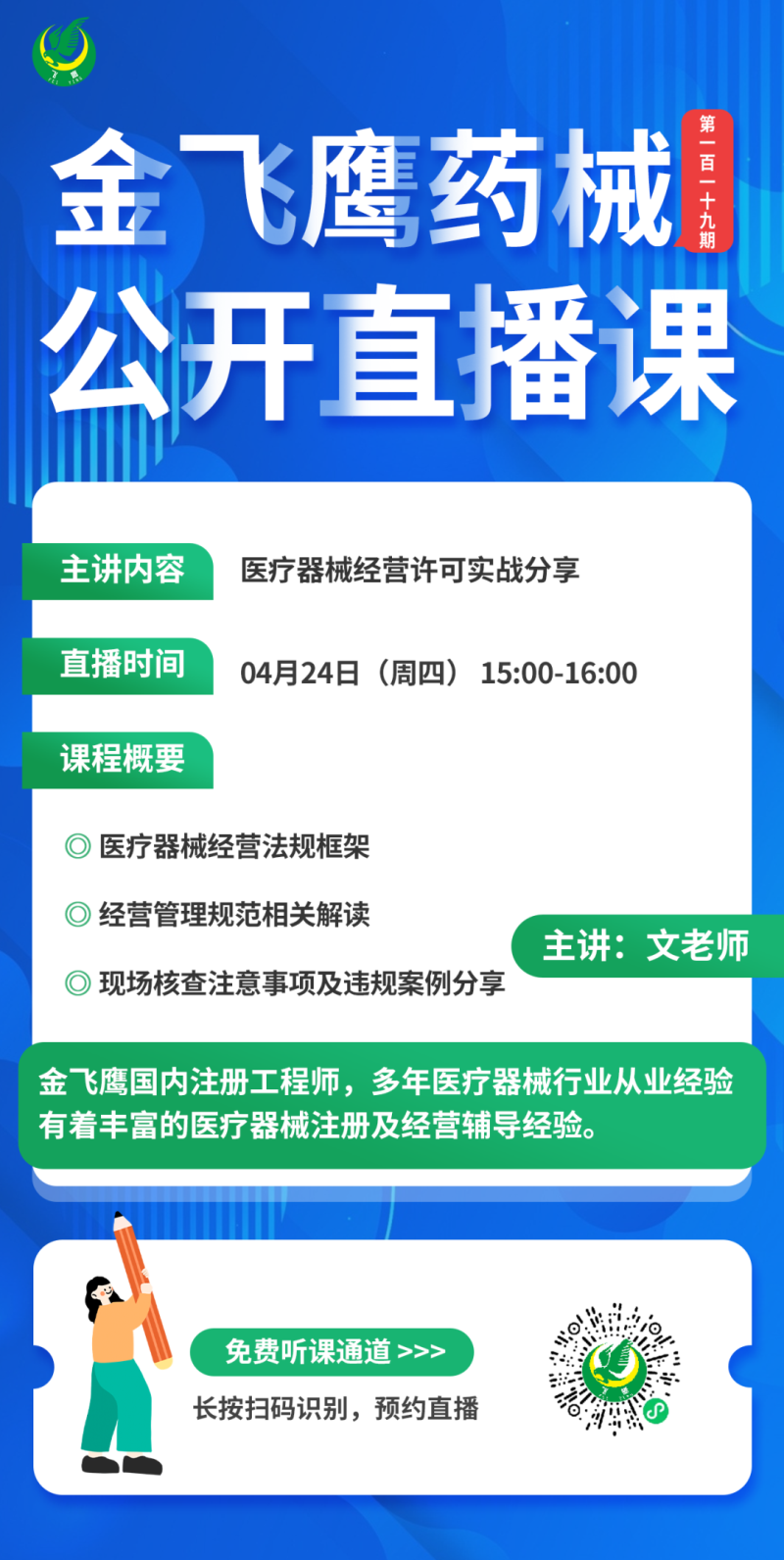 4月24日下午3點,金飛鷹國內(nèi)注冊工程師、有著豐富醫(yī)療器械注冊及經(jīng)驗輔導經(jīng)驗的文老師給大家?guī)怼夺t(yī)療器械經(jīng)營許可實戰(zhàn)經(jīng)驗分享》,培訓內(nèi)容包括醫(yī)療器械經(jīng)營法規(guī)框架、經(jīng)營管理規(guī)范相關解讀、現(xiàn)場核查注意事項及違規(guī)案例分享,結合他本身積累的豐富經(jīng)營許可辦理經(jīng)驗,從理論解讀到實操指導,全方位剖析醫(yī)療器械經(jīng)營許可的申報要點與技巧。