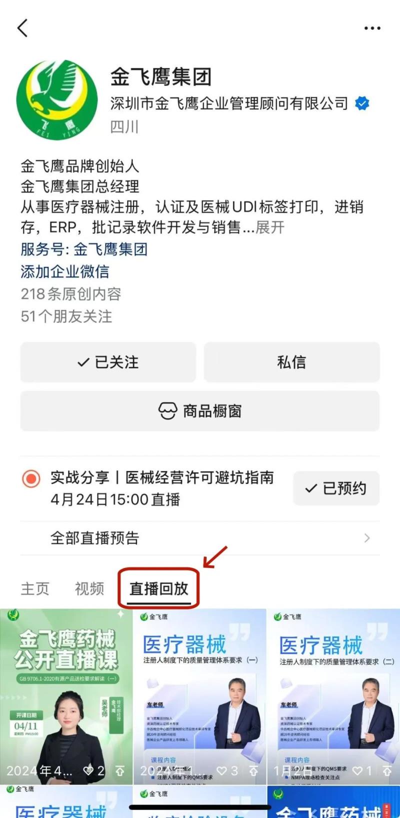 往期直播培訓課程支持回放,關注“金飛鷹藥械咨詢服務”視頻號并點擊視頻號主頁,即可查看“直播回放”哦~
