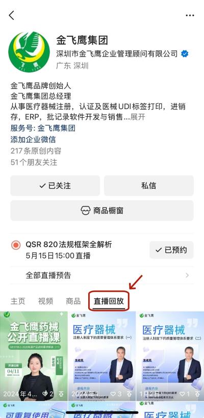 往期直播培訓(xùn)課程支持回放,關(guān)注“金飛鷹藥械咨詢服務(wù)”視頻號并點(diǎn)擊視頻號主頁,即可查看“直播回放”哦~