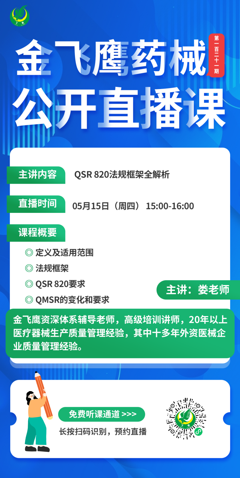 金飛鷹直播培訓(xùn),是每周一次的固定培訓(xùn)欄目,優(yōu)選金飛鷹國內(nèi)外資深注冊/項(xiàng)目老師定期為大家講解醫(yī)療器械注冊相關(guān)知識,解答大家在醫(yī)療器械注冊過程中的諸多疑問。