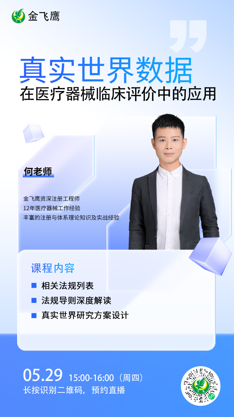 5月29日下午3點,金飛鷹資深注冊工程師、有著12年醫(yī)療器械行業(yè)從業(yè)經(jīng)驗的何老師給大家?guī)怼墩鎸嵤澜鐢?shù)據(jù)在醫(yī)療器械臨床評價中的應用》,他將立足法規(guī)要求,結(jié)合實戰(zhàn)案例,重點解析真實世界研究方案設計要點,為企業(yè)高效開展真實世界數(shù)據(jù)應用提供專業(yè)指導。