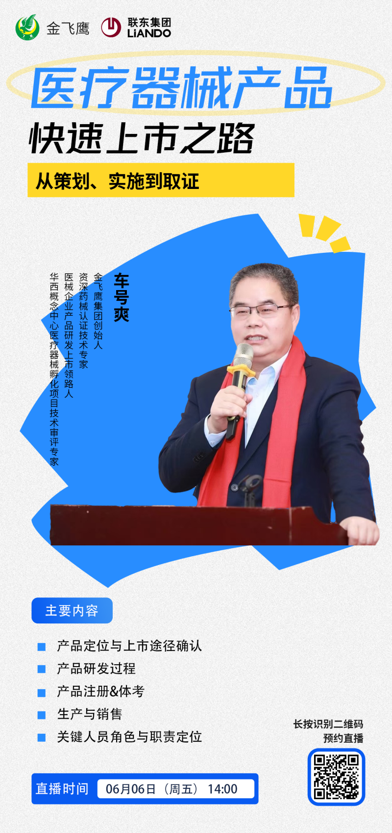 今年4月,金飛鷹與成都聯(lián)東U谷聯(lián)合主辦了一場(chǎng)線下培訓(xùn),得到了園區(qū)企業(yè)的一致好評(píng)?;谇捌诹己玫暮献骰A(chǔ),金飛鷹與聯(lián)東U谷產(chǎn)業(yè)園區(qū)的合作進(jìn)一步深化升級(jí)。6月6日,我們將面向全國(guó)聯(lián)東U谷產(chǎn)業(yè)園區(qū)的醫(yī)療器械企業(yè),開展“醫(yī)療器械產(chǎn)品快速上市之路”線上專題培訓(xùn),由集團(tuán)創(chuàng)始人車號(hào)爽老師進(jìn)行分享,并通過“金飛鷹集團(tuán)”視頻號(hào)同步直播。車?yán)蠋煂⒔Y(jié)合金飛鷹18年來(lái)積累的4000+成功案例,為企業(yè)提供可落地執(zhí)行的實(shí)操指導(dǎo),幫助企業(yè)優(yōu)化注冊(cè)申報(bào)流程,縮短產(chǎn)品上市周期,提升市場(chǎng)競(jìng)爭(zhēng)力。