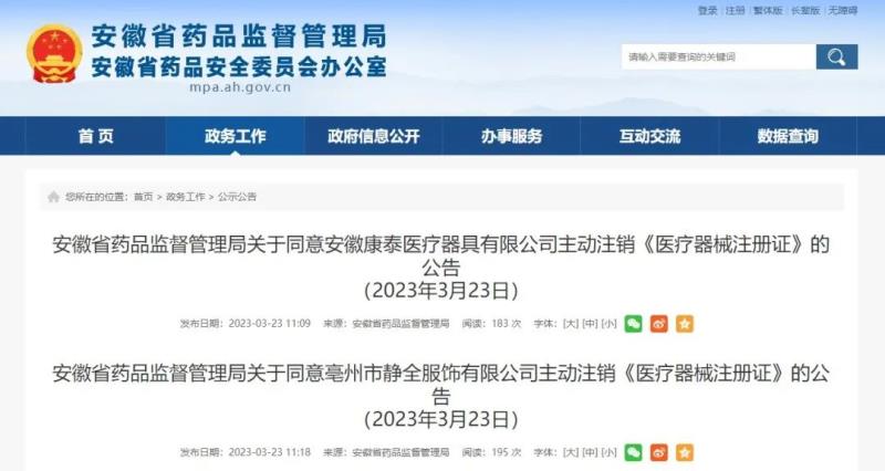 近日,安徽省藥監(jiān)局官網(wǎng)發(fā)布兩則公告,對安徽康泰醫(yī)療器具有限公司及亳州市靜全服飾有限公司持有的《醫(yī)療器械注冊證》依法予以注銷,具體明細(xì)如下: