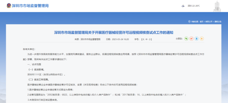3月24日,深圳市市場監(jiān)督管理局發(fā)布《關(guān)于開展醫(yī)療器械經(jīng)營許可遠(yuǎn)程視頻核查試點(diǎn)工作的通知》,具體內(nèi)容如下: