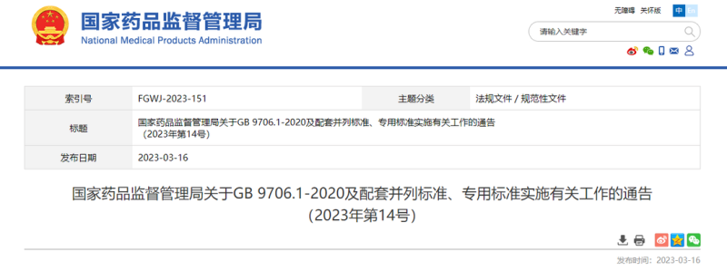 3月16日,國(guó)家藥監(jiān)局官網(wǎng)發(fā)布《關(guān)于GB 9706.1-2020及配套并列標(biāo)準(zhǔn)、專用標(biāo)準(zhǔn)實(shí)施有關(guān)工作的通告(2023年第14號(hào))》(以下簡(jiǎn)稱《通告》),對(duì)注冊(cè)備案及檢驗(yàn)時(shí)【相關(guān)標(biāo)準(zhǔn)執(zhí)行要求】明確如下: