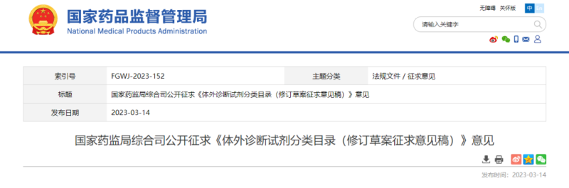 3月14日,國家藥監(jiān)局官網(wǎng)發(fā)布公告稱,為貫徹落實(shí)新修訂的《醫(yī)療器械監(jiān)督管理?xiàng)l例》《體外診斷試劑注冊與備案管理辦法》及《體外診斷試劑分類規(guī)則》中體外診斷試劑分類管理的要求,夯實(shí)體外診斷試劑分類管理基礎(chǔ),國家藥監(jiān)局組織開展了《體外診斷試劑分類目錄》修訂工作,形成了《體外診斷試劑分類目錄(修訂草案征求意見稿)》(以下簡稱《征求意見稿》),并向社會公開征求意見。