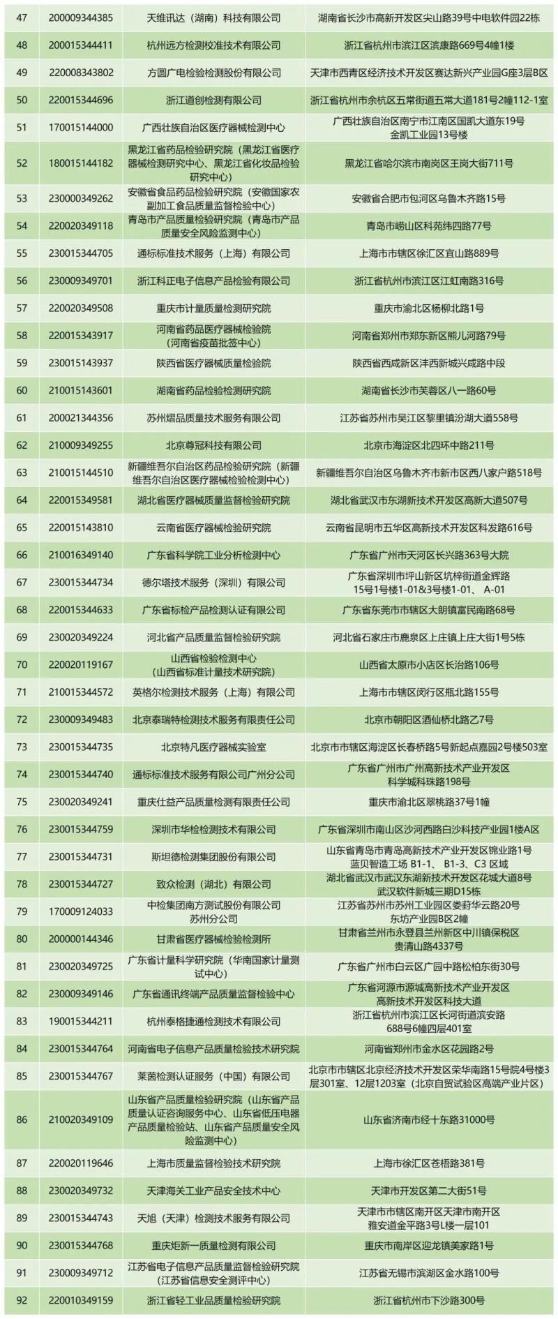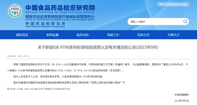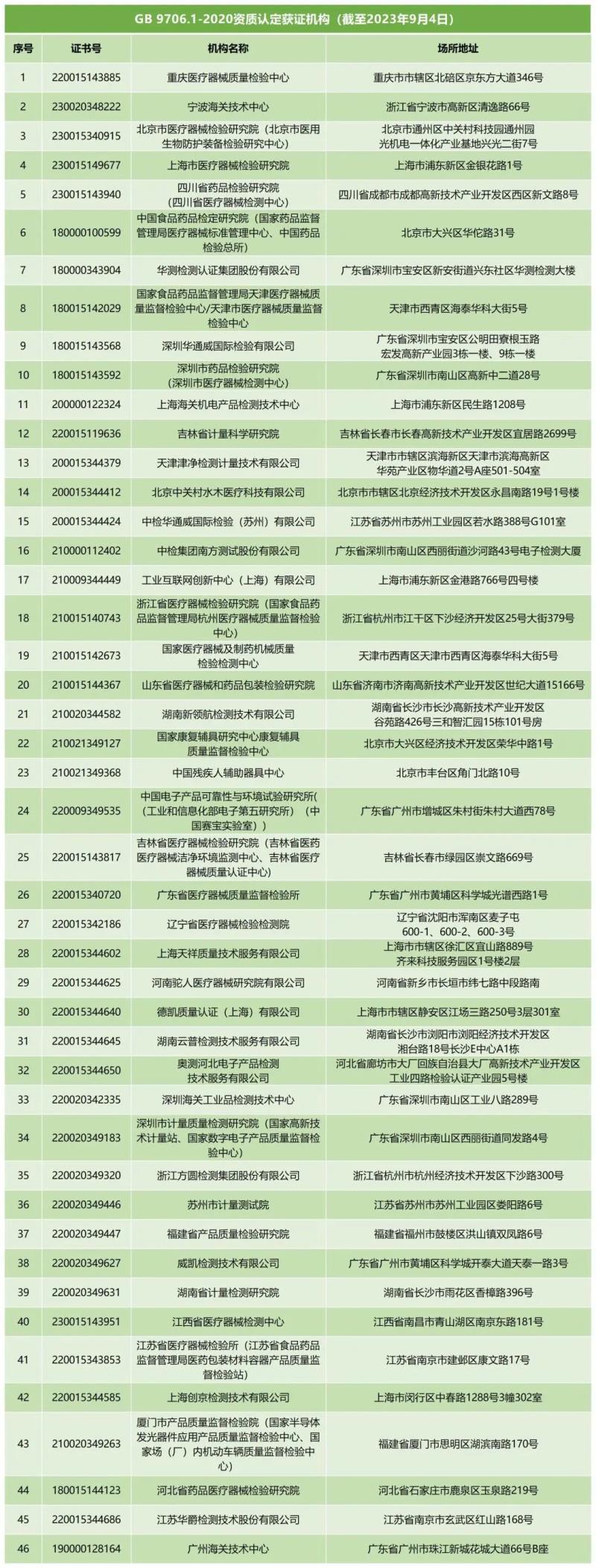 9月5日,中檢院官網公布了截至2023年9月4日,75個新版GB 9706系列標準檢驗資質認定情況和GB 9706.1-2020、YY 9706.102-2021獲證機構信息。我們從附件表格中可以看到,全國共有92家GB 9706.1-2020資質認定獲證機構,也就是說,可以承擔新標的安規(guī)檢測工作,具體如下: