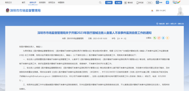 3月9日,深圳市市場監(jiān)督管理局官網(wǎng)發(fā)布《關(guān)于開展2023年醫(yī)療器械注冊人備案人不良事件監(jiān)測自查工作的通知》,具體內(nèi)容如下: