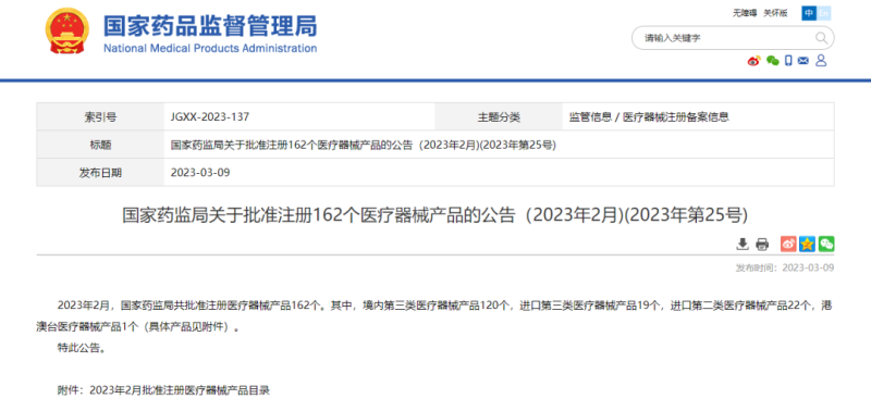 據(jù)國家藥監(jiān)局官網(wǎng)最新公告,2023年2月,國家藥監(jiān)局共批準(zhǔn)注冊醫(yī)療器械產(chǎn)品162個(gè)。其中,境內(nèi)第三類醫(yī)療器械產(chǎn)品120個(gè),進(jìn)口第三類醫(yī)療器械產(chǎn)品19個(gè),進(jìn)口第二類醫(yī)療器械產(chǎn)品22個(gè),港澳臺(tái)醫(yī)療器械產(chǎn)品1個(gè)(具體產(chǎn)品見附件)。
