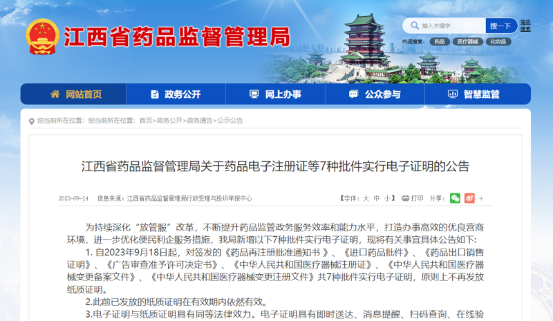 1. 自2023年9月18日起,對簽發(fā)的《藥品再注冊批準(zhǔn)通知書 》、《進口藥品批件》、《藥品出口銷售證明》、《廣告審查準(zhǔn)予許可決定書》、《中華人民共和國醫(yī)療器械注冊證》、《中華人民共和國醫(yī)療器械變更備案文件》、《中華人民共和國醫(yī)療器械變更注冊文件》共7種批件實行電子證明,原則上不再發(fā)放紙質(zhì)證明。