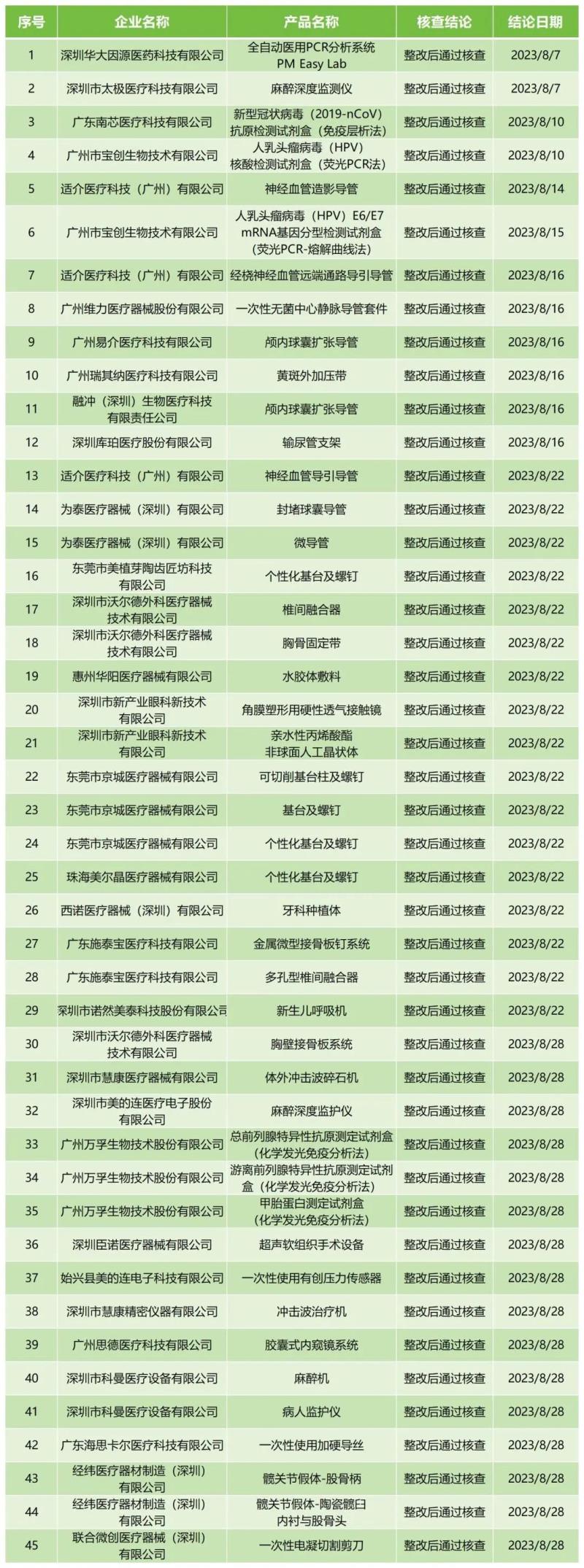 9月18日,廣東省藥監(jiān)局官網(wǎng)公布2023年8月醫(yī)療器械注冊質(zhì)量管理體系核查結(jié)果,包括深圳市沃爾德外科醫(yī)療器械技術(shù)有限公司、廣州萬孚生物技術(shù)股份有限公司、深圳市科曼醫(yī)療設(shè)備有限公司在內(nèi)的32家公司共計45款產(chǎn)品,均為“整改后通過核查”。具體明細見下方表格: