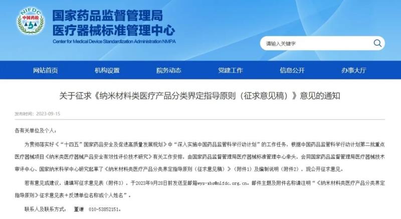 近日,國(guó)家藥監(jiān)局醫(yī)療器械標(biāo)準(zhǔn)管理中心官網(wǎng)發(fā)布《納米材料醫(yī)療產(chǎn)品分類界定指導(dǎo)原則(征求意見稿)》,具體內(nèi)容如下: