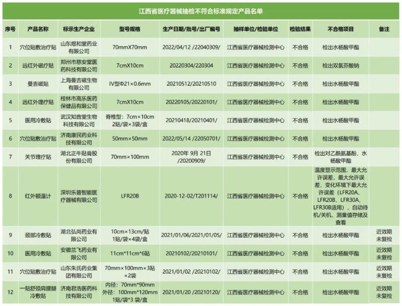 近日,江西省藥品監(jiān)管局發(fā)布2023年第2期醫(yī)療器械監(jiān)督抽檢信息公告。此次共檢出12批次不合格產(chǎn)品,涉及:標(biāo)稱深圳樂(lè)普智能醫(yī)療器械有限公司生產(chǎn)的紅外額溫計(jì)(LFR20B)、標(biāo)稱山東煜和堂藥業(yè)有限公司生產(chǎn)的穴位貼敷治療貼、標(biāo)稱鄭州市慈安堂醫(yī)藥科技有限公司生產(chǎn)的遠(yuǎn)紅外磁療貼等產(chǎn)品,具體如下: