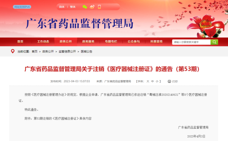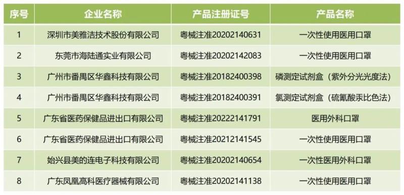 近日,廣東省藥監(jiān)局官網(wǎng)發(fā)布通告稱,按照《醫(yī)療器械注冊(cè)管理辦法》的規(guī)定,根據(jù)企業(yè)申請(qǐng),廣東省藥品監(jiān)督管理局已依法注銷“粵械注準(zhǔn)20202140631”等8個(gè)醫(yī)療器械注冊(cè)證,其中包括一次性使用醫(yī)用口罩、磷測(cè)定試劑盒(紫外分光光度法)等產(chǎn)品,具體明細(xì)如下: