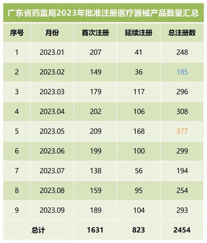 我們同步匯總了2023年各個月份廣東省藥監(jiān)局批準(zhǔn)注冊的醫(yī)療器械產(chǎn)品數(shù)量(見下方表格),從表格中可以看出,截至9月底,2023年廣東藥監(jiān)局總計(jì)批準(zhǔn)注冊第二類醫(yī)療器械產(chǎn)品2454個,其中首次注冊1631個,延續(xù)注冊823個。