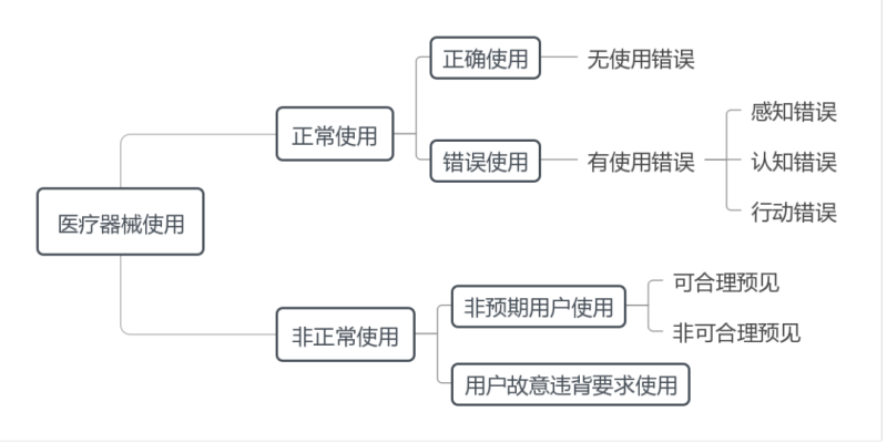 正常使用從使用結(jié)果角度可分為正確使用和錯誤使用,其中正確使用是指沒有錯誤使用的正常使用,其產(chǎn)生的風(fēng)險均可接受;錯誤使用是指用戶行動或行動缺失導(dǎo)致異于注冊申請人或用戶所預(yù)期的醫(yī)療器械響應(yīng),其可能降低醫(yī)療器械的有效性或者產(chǎn)生不可接受的風(fēng)險,導(dǎo)致患者、用戶或相關(guān)人員受到傷害或死亡。