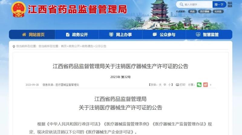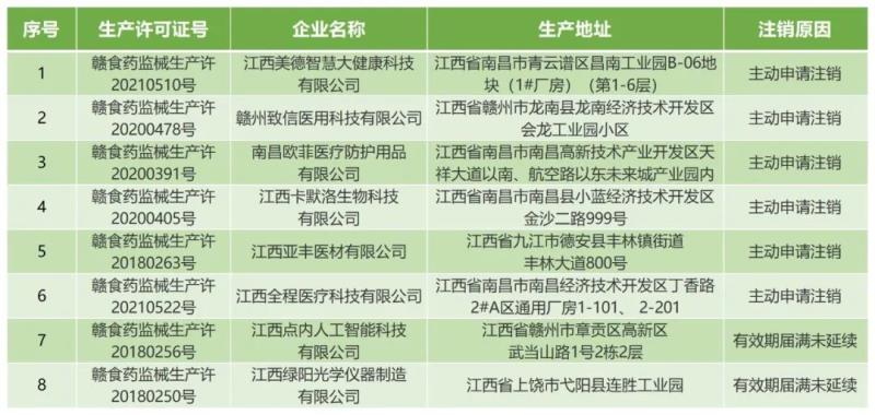 近日,江西省藥監(jiān)局發(fā)布公告稱,注銷江西美德智慧大健康科技有限公司等8家公司的醫(yī)療器械生產許可證,以下為具體明細: