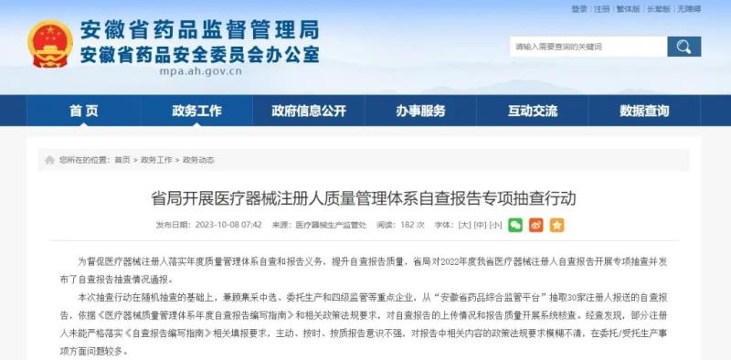 該局指出,本次抽查行動在隨機抽查的基礎(chǔ)上,兼顧集采中選、委托生產(chǎn)和四級監(jiān)管等重點企業(yè),從“安徽省藥品綜合監(jiān)管平臺”抽取30家注冊人報送的自查報告,依據(jù)《醫(yī)療器械質(zhì)量管理體系年度自查報告編寫指南》(以下簡稱《編寫指南》)和相關(guān)政策法規(guī)要求,對自查報告的上傳情況和報告質(zhì)量開展系統(tǒng)核查。經(jīng)查發(fā)現(xiàn),部分注冊人未能嚴格落實《編寫指南》相關(guān)填報要求,主動、按時、按質(zhì)報告意識不強,對報告中相關(guān)內(nèi)容的政策法規(guī)要求模糊不清,在委托/受托生產(chǎn)事項方面問題較多。