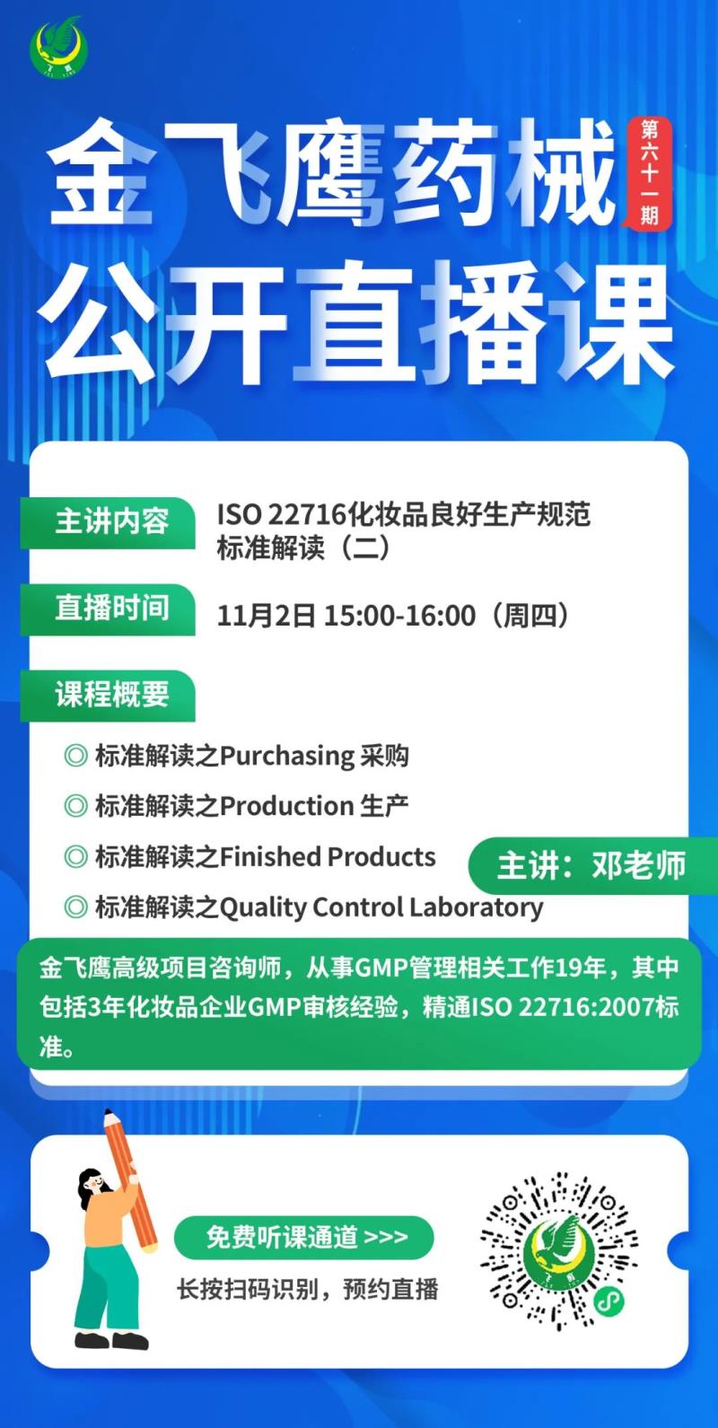 11月2日下午3點(diǎn),金飛鷹高級項(xiàng)目咨詢師,從事GMP管理相關(guān)工作19年,其中包括3年化妝品企業(yè)GMP審核經(jīng)驗(yàn)的鄧?yán)蠋煟?/span>給大家?guī)?/span>《ISO 22716化妝品良好生產(chǎn)規(guī)范標(biāo)準(zhǔn)解讀(二)》,繼續(xù)給大家詳細(xì)解讀標(biāo)準(zhǔn)的采購、生產(chǎn)、成品、外包、投訴和召回等版塊,大家千萬不要錯(cuò)過了哦!