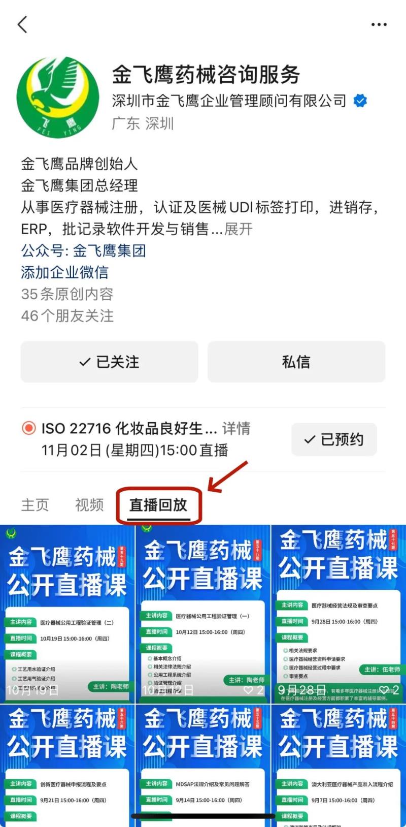 往期直播培訓(xùn)課程支持回放,關(guān)注“金飛鷹藥械咨詢服務(wù)”視頻號并點(diǎn)擊視頻號主頁,即可查看“直播回放”哦~