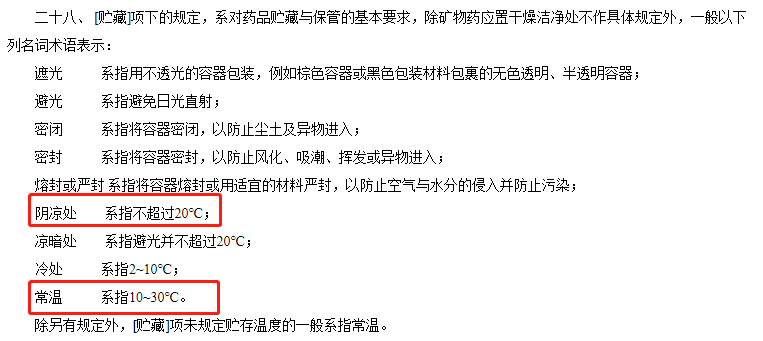 根據(jù)國家藥監(jiān)局食品藥品審核查驗中心的回復(fù),參照《中國藥典》(2020年版)第一部“凡例”中內(nèi)容:“陰涼處系指不超過20℃”、“常溫系指10~30℃”,建議企業(yè)可根據(jù)自身產(chǎn)品存儲溫度要求借鑒參考。