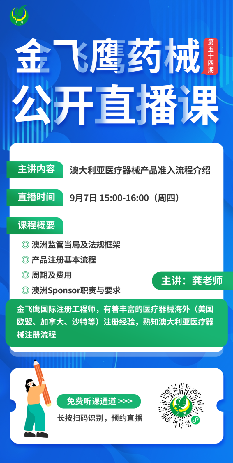 9月7日下午3點,大家熟悉的金飛鷹國際注冊工程師龔老師又來啦!她本人有著有著豐富的醫(yī)療器械海外(美國、歐盟、加拿大、沙特等)注冊經(jīng)驗,熟知澳大利亞醫(yī)療器械注冊流程,本次她給大家?guī)怼栋拇罄麃嗎t(yī)療器械產(chǎn)品準入流程介紹》,培訓內(nèi)容包括澳洲監(jiān)管當局及法規(guī)框架、產(chǎn)品注冊基本流程、周期及費用、澳洲Sponsor職責與要求等,有意向將產(chǎn)品銷售至澳大利亞的醫(yī)械企業(yè)千萬不要錯過了哦!