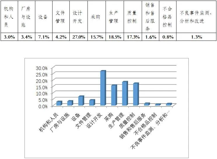 從各章節(jié)不符合項(xiàng)總數(shù)占比來(lái)看,占據(jù)前四位的分別為設(shè)計(jì)開(kāi)發(fā)(27%)、生產(chǎn)管理(18.5%)、質(zhì)量管理(17.3%)和采購(gòu)(15.7%)。