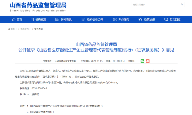 近日,山西省藥監(jiān)局官網(wǎng)發(fā)布《山西省醫(yī)療器械生產(chǎn)企業(yè)管理者代表管理制度(試行)(征求意見稿)》(以下簡稱《征求意見稿》),并向社會公開征求意見。