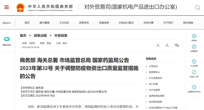 近日,國家商務部官網(wǎng)發(fā)布《關(guān)于調(diào)整防疫物資出口質(zhì)量監(jiān)管措施的公告》,就非醫(yī)用口罩、新型冠狀病毒檢測試劑、醫(yī)用口罩、醫(yī)用防護服、呼吸機、紅外體溫計六大類防疫物資產(chǎn)品出口質(zhì)量監(jiān)管措施作出如下調(diào)整: