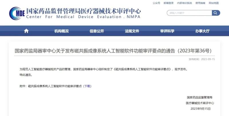 近日,國(guó)家藥監(jiān)局器審中心官網(wǎng)發(fā)布《磁共振成像系統(tǒng)人工智能軟件功能審評(píng)要點(diǎn)》(以下簡(jiǎn)稱(chēng)《審評(píng)要點(diǎn)》),我們將其中重點(diǎn)內(nèi)容摘錄如下: