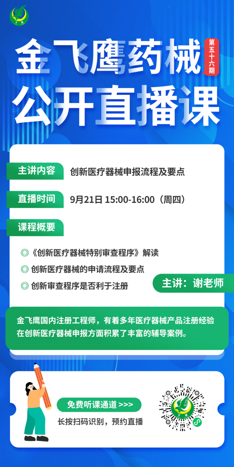 金飛鷹直播培訓(xùn),是每周一次的固定培訓(xùn)欄目,優(yōu)選金飛鷹國(guó)內(nèi)外資深注冊(cè)/項(xiàng)目老師定期為大家講解醫(yī)療器械注冊(cè)相關(guān)知識(shí),解答大家在醫(yī)療器械注冊(cè)過(guò)程中的諸多疑問(wèn)。