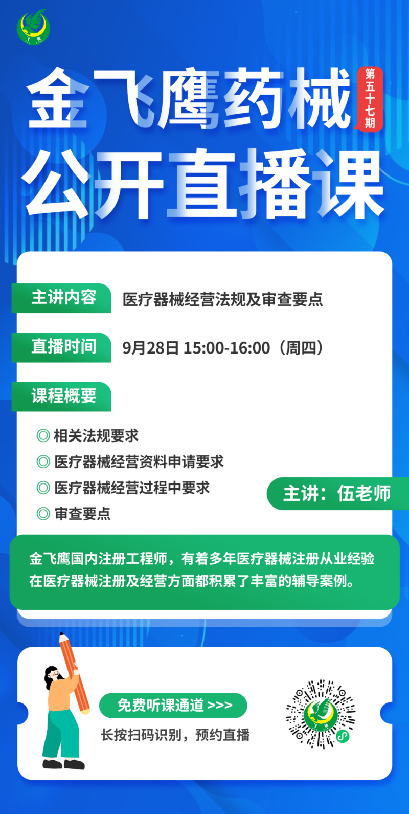 9月28日下午3點,金飛鷹國內(nèi)注冊工程師,有著多年醫(yī)療器械注冊從業(yè)經(jīng)驗,在醫(yī)療器械注冊及經(jīng)營方面都積累了豐富輔導案例的伍老師,給大家?guī)怼夺t(yī)療器械經(jīng)營法規(guī)及審查要點》,培訓內(nèi)容包括相關法規(guī)要求、醫(yī)療器械經(jīng)營資料申請要求、醫(yī)療器械經(jīng)營過程中要求、審查要點等,大家千萬不要錯過了哦!