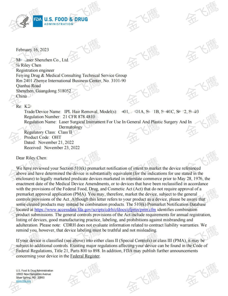而說(shuō)到IPL脫毛儀注冊(cè),我估計(jì)不少企業(yè)首先想到的就是金飛鷹。當(dāng)然這并非小編王婆賣瓜,這都是一個(gè)個(gè)案例積累出來(lái)的!去年我們跟大家分享過(guò)不少IPL脫毛儀國(guó)內(nèi)外注冊(cè)案例,比如曾創(chuàng)下了單日取證15張(其中13張為脫毛儀)的“神話”般成績(jī),也曾在一年中拿下了十多個(gè)IPL脫毛儀510(k)號(hào),可能還有不太了解我們的朋友,這里就再帶大家回顧一下?