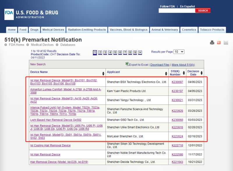 接下來(lái)我們照例打開(kāi)FDA官網(wǎng),按“OHT”代碼檢索并截取了最新數(shù)據(jù)(截至美國(guó)時(shí)間2023年4月10日),我們可以看到,2023年FDA官網(wǎng)公布的總共有7款I(lǐng)PL脫毛儀產(chǎn)品,這其中有4款產(chǎn)品的K號(hào)是由金飛鷹申報(bào)的,再加上4月10日新增的暫未在網(wǎng)站顯示的兩個(gè)K號(hào),截至目前總共9個(gè)脫毛儀K號(hào),6個(gè)都是我們做的,占比近70%。