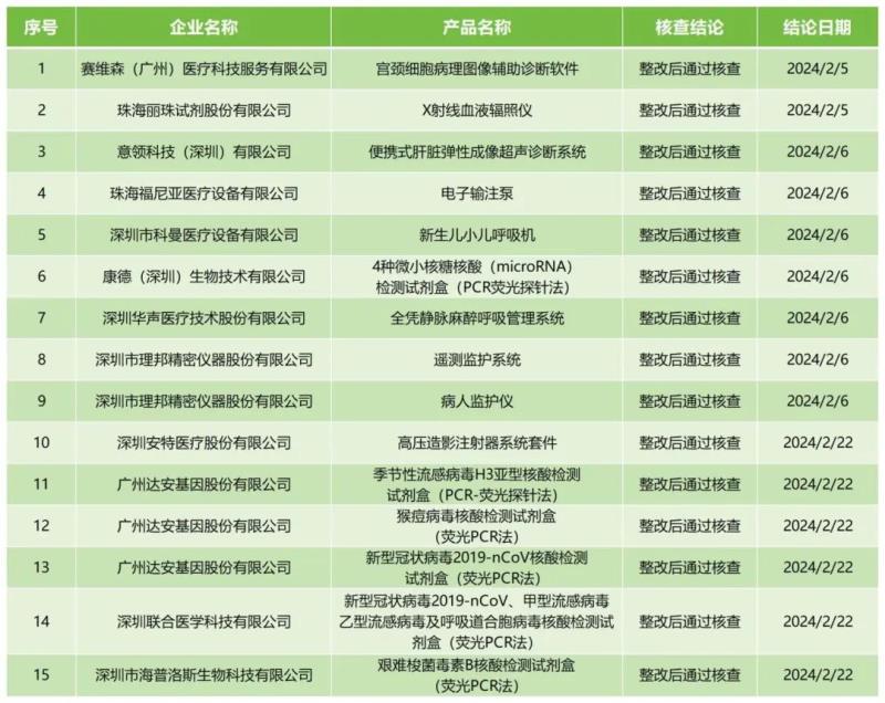 近日,廣東省藥監(jiān)局官網(wǎng)公布2024年2月醫(yī)療器械注冊(cè)質(zhì)量管理體系核查結(jié)果,包括廣州達(dá)安基因股份有限公司、深圳市科曼醫(yī)療設(shè)備有限公司、深圳市理邦精密儀器股份有限公司在內(nèi)的12家企業(yè)共計(jì)15款產(chǎn)品,均為“整改后通過核查”。具體明細(xì)見下方表格: