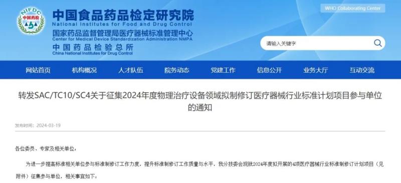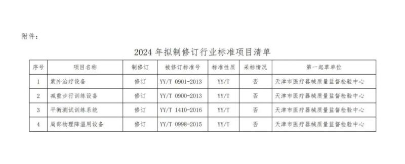 3月19日,國家藥監(jiān)局醫(yī)療器械標(biāo)管中心轉(zhuǎn)發(fā)了全國醫(yī)用電器標(biāo)準(zhǔn)化技術(shù)委員會(huì)物理治療設(shè)備分技術(shù)委員會(huì)《關(guān)于征集2024年度物理治療設(shè)備領(lǐng)域擬制修訂醫(yī)療器械行業(yè)標(biāo)準(zhǔn)計(jì)劃項(xiàng)目參與單位的通知》,2024年擬對(duì)紫外治療設(shè)備、減重步行訓(xùn)練設(shè)備、平衡測(cè)試訓(xùn)練系統(tǒng)、局部物理降溫用設(shè)備的行業(yè)標(biāo)準(zhǔn)進(jìn)行制修訂,具體如下: