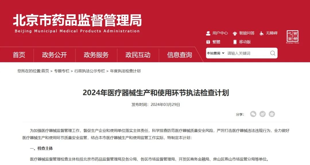 近日,北京市藥監(jiān)局發(fā)布《2024年醫(yī)療器械生產(chǎn)和使用環(huán)節(jié)執(zhí)法檢查計劃》,其中提到,截至2023年12月31日,全市共有醫(yī)療器械生產(chǎn)企業(yè)1000家,醫(yī)療器械使用單位11219家。依據(jù)《醫(yī)療器械生產(chǎn)監(jiān)督管理辦法》和《醫(yī)療器械使用質(zhì)量監(jiān)督管理辦法》要求,各級監(jiān)管部門要按照計劃要求,嚴(yán)格落實監(jiān)管任務(wù)。具體如下: