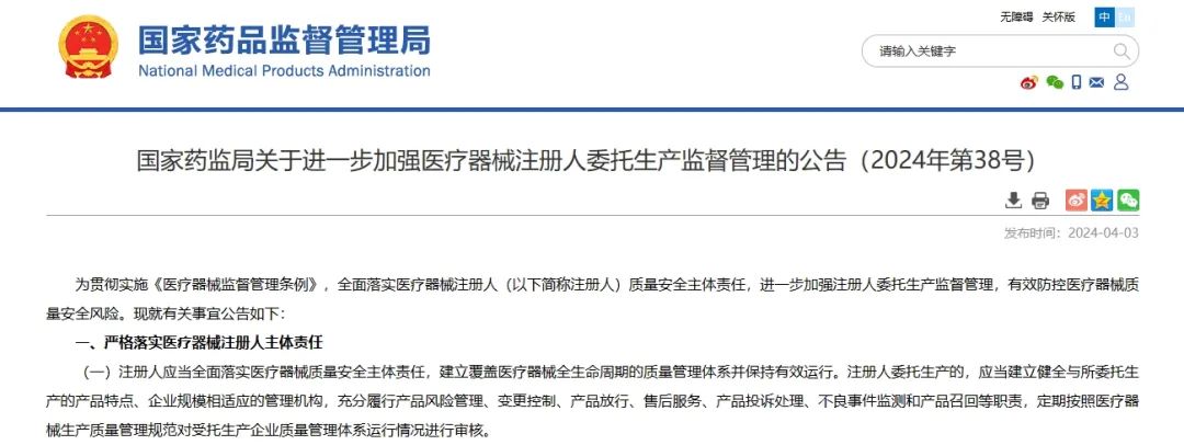 4月3日,國家藥監(jiān)局發(fā)布《關(guān)于進(jìn)一步加強(qiáng)醫(yī)療器械注冊人委托生產(chǎn)監(jiān)督管理的公告(2024年第38號)》,具體內(nèi)容如下: