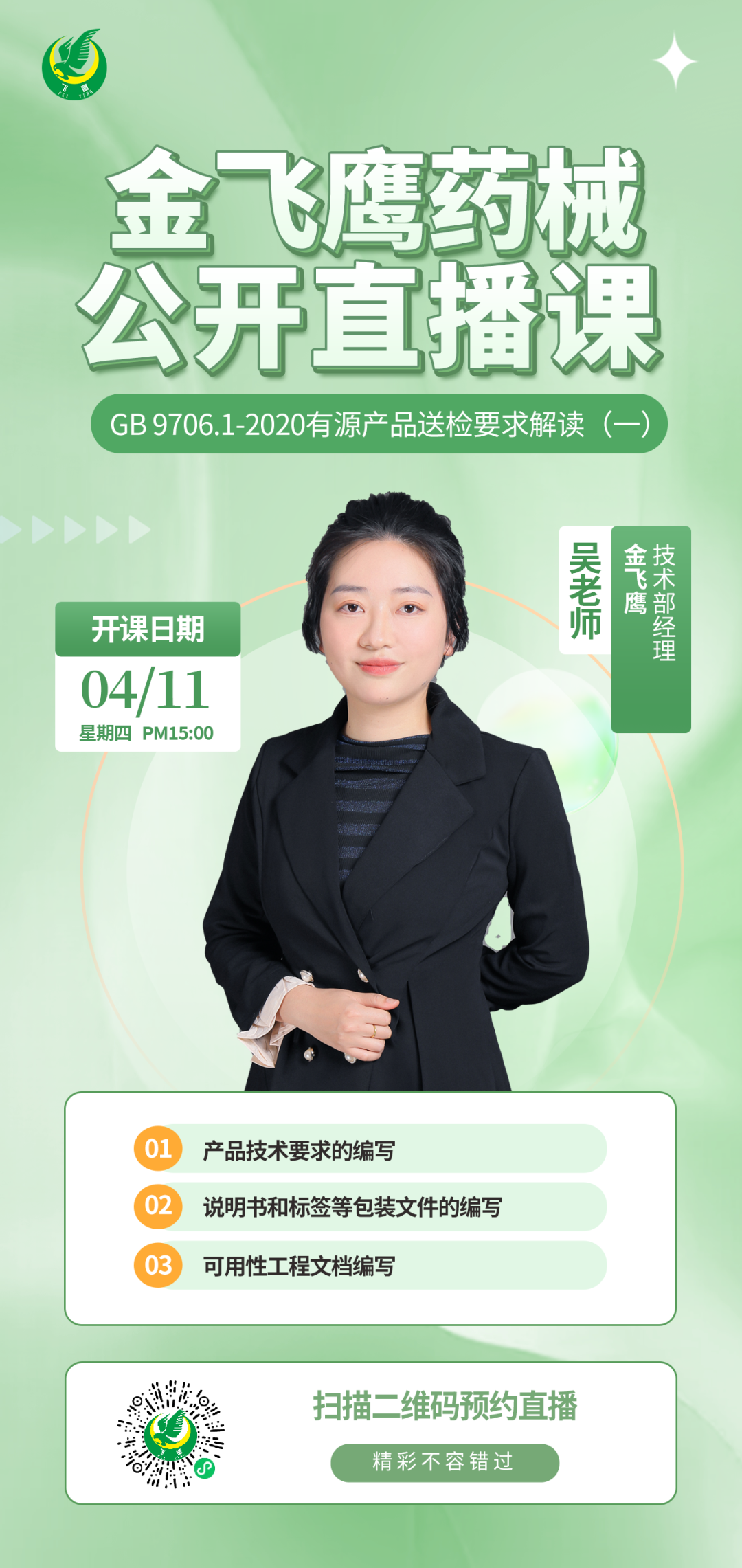 4月11日下午3點,金飛鷹技術(shù)部經(jīng)理兼高級講師,有著近十年醫(yī)療器械行業(yè)工作經(jīng)驗,尤為擅長【有源產(chǎn)品】合規(guī)準入上市認證的吳老師,給大家?guī)怼禛B 9706.1-2020有源產(chǎn)品送檢要求解讀(一)》,培訓(xùn)內(nèi)容包括產(chǎn)品技術(shù)要求的編寫、說明書和標簽等包裝文件的編寫、可用性工程編寫等,因涉及到的內(nèi)容較多,這一主題將分為兩期內(nèi)容來講,大家記得要持續(xù)關(guān)注哦!